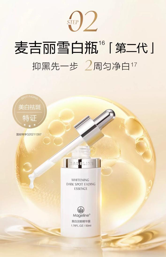 雪白瓶是改善肤色暗沉、色素沉淀的关键。它持有国家认证的美白祛斑特证,成分上采用 Mage-whit® 光感技术,能从源头阻断黑色素生成,同时添加 99.9% 高纯度烟酰胺与 1500 万焕亮因子,层层淡化痘印、晒斑,让肤色逐渐变得均匀透亮。