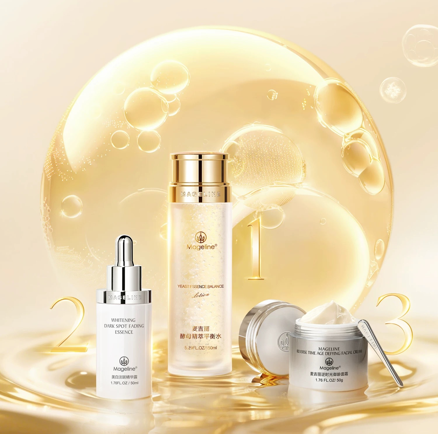 麦吉丽时光三部曲的设计逻辑,围绕 “肌底调理 - 精准焕亮 - 抗老锁效” 展开,每一步都针对性解决肌肤核心问题,形成层层递进的养护闭环,无需叠加过多产品,就能满足日常护肤的核心需求。