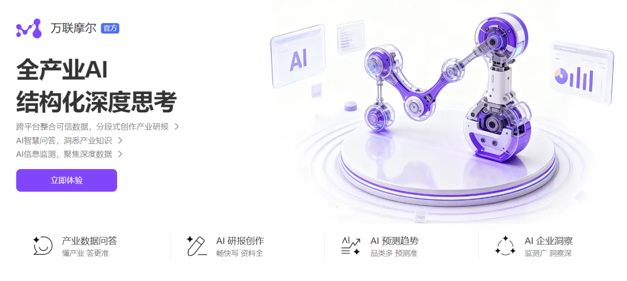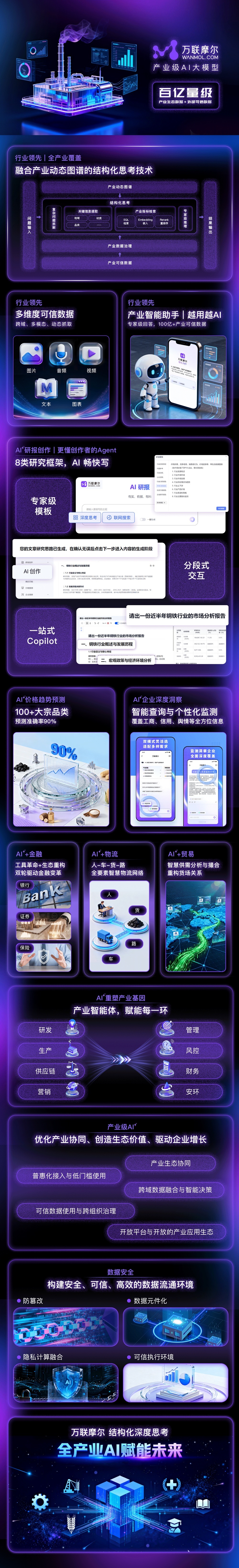 据了解,作为首个面向全产业打造的AI大模型,万联摩尔不仅包含产业知识问答、产业数据问答等基础功能,同时具备AI研报创作、价格预测、企业洞察三大核心功能。基于万联易达打造的扎实、可信“数据底座”以及“融合产业动态图谱的结构化思考技术”,使得万联摩尔全产业大模型完成了从“能对话”到实现“懂产业、能决策”的关键跨越。