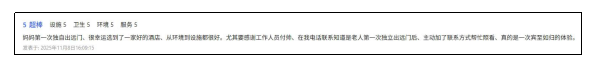 事后,家属在携程平台给予酒店五星好评,评价中提到:“妈妈第一次独自出远门,很幸运选到了这家好酒店,从环境到设施都很好。尤其感谢酒店工作人员,在电话沟通中得知老人首次独立出远门后,主动加联系方式帮忙照看,真的是一次宾至如归的体验。” 这份认可,既是对酒店服务的肯定,更是对行业 “超越预期服务” 的有力印证。