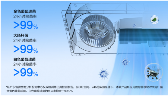 健康防护方面,海尔智能除菌浴霸FS3的全时净化抗菌舱展现出强悍实力。机身通体添加抗菌新材料,从源头抑制细菌滋生,实现24小时不间断抗菌防护,配合等离子除菌专利技术,可捕捉分解大肠杆菌、金黄色葡萄球菌等浴室常见病菌。等离子模块经广东省微生物分析检测中心认证,对大肠杆菌、金黄色葡萄球菌、白色葡萄球菌的杀灭率均大于99.9%,为母婴家庭等敏感群体筑牢健康防线。