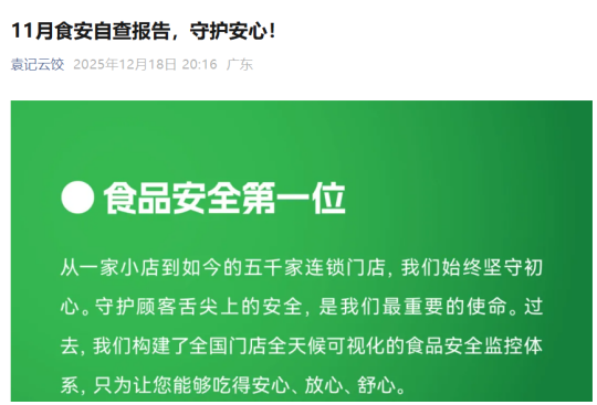 为确保监管体系落地生根,袁记云饺搭建起“总部-区域-门店”三级垂直管理架构,明确各环节责任,形成策略制定、监督执行到效果反馈的完整闭环;同时建立运营、品控、培训与供应链四方协同机制,通过联合巡检、定期会商等方式,高效解决跨部门问题,让严苛标准渗透至全国近5000家门店的每一个操作细节。此外,袁记云饺还与中国检验检疫科学研究院等权威机构深化技术协作,并定期公开食品安全自查报告,构建起行业联动、社会共建的质量治理生态。