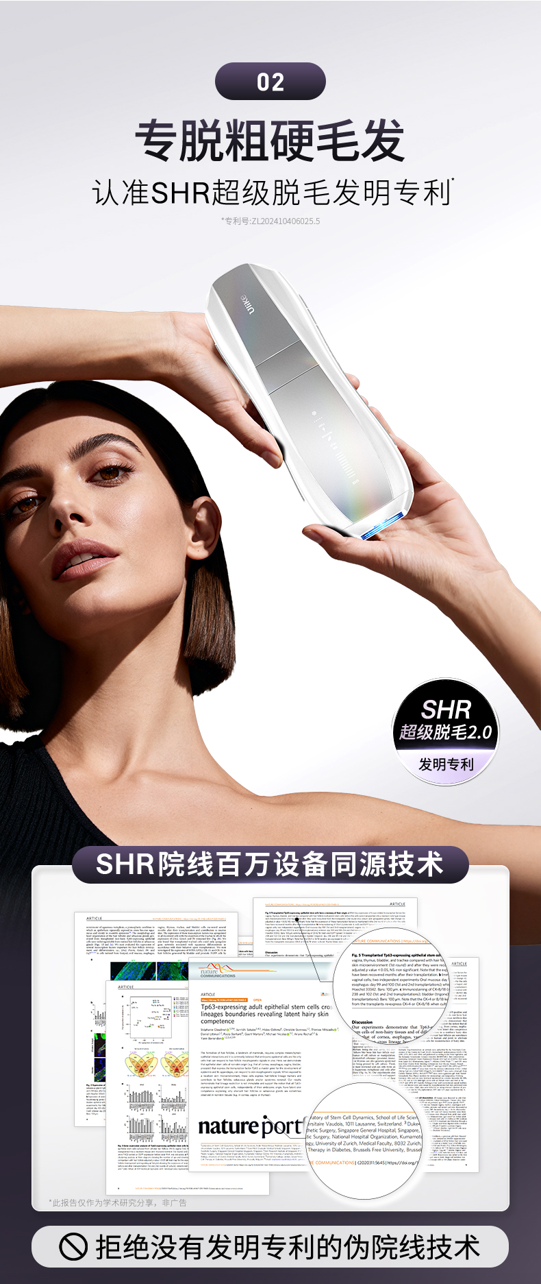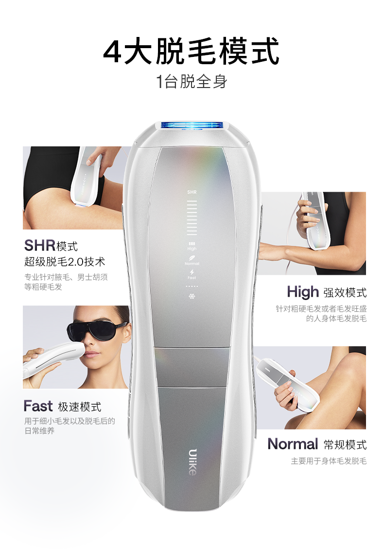 理解了肌肤的颜色,还需理解不同部位毛发的“性格”。Ulike Pro 10S深谙此道,它提供了四大脱毛模式,让你能像管理T区与脸颊一样,对身体进行分区护理。对于腋下、比基尼线乃至男士粗硬胡须这类“顽固分子”,SHR超级脱毛2.0模式是最佳攻坚武器。它承袭了院线百万设备的同源技术,从根源上延缓毛发再生,专为攻克粗硬毛发设计。