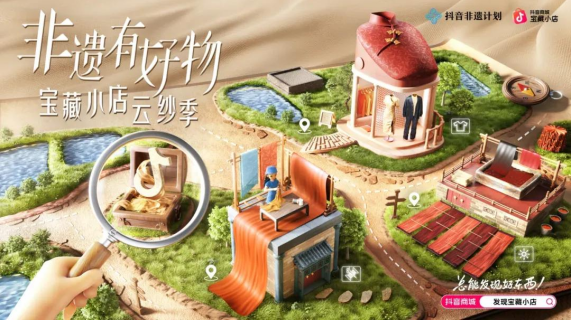 非遗领域也有不少好店铺、好商品。在“寻宝岭南·云纱季”专项中,“宝藏小店”联合“抖音非遗计划”,为香云纱这一非遗品类定制了从商家培育、内容热点打造到全域资源扶持的全链路方案。通过邀请非遗守护人溯源、围绕活动打造#挑战中式美学穿搭天花板 等热点话题、撮合达人专场直播,并给予搜索与商城资源倾斜,最终带动活动商品曝光超3.3亿,相关品类GMV同比增长超103%,成功助力这一传统技艺走进大众视野。