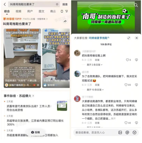 情绪是更直接的催化剂。江苏“苏超”联赛期间,“叫南哥”的呼声刷屏网络。拖鞋品牌“珂缔缘”迅速反应,将这句口号印上拖鞋,从设计到上架只用了极短时间。当球迷们在直播间里为胜利欢呼时,这双拖鞋就成了表达支持的最佳纪念品。一场由内容热点催生的消费爆发,就这样自然发生了,小店的生意也跟着火爆起来。