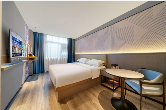 针对客房区域,柏曼酒店对床屏、床头柜、办公桌椅等核心体验部件进行全面更换,同时保留仍具使用价值的床背景板、迷你吧墙纸、风管机、窗帘等设施,通过翻新与贴膜实现“再生”。相比原单房约8万元的造价,该精准改造模式显著节约了投入成本,并延长了产品生命周期。以提升住客体验感为前提的基础上降低投入成本,将改造项目做到精准到每一盏灯,每一块木板。