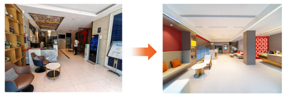 在外观改造上,酒店首先扩大落地玻璃面积,由双开门扩展为三开门,强化空间通透感。门头招牌、立面灯光等均按柏曼酒店3.0标准进行升级,整体呈现简洁大气的现代形象。