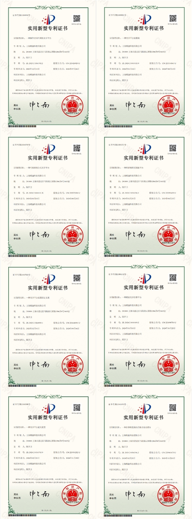 自成立以来,精迦科技秉持 “以市场需求为导向,以产品质量为根本,以诚实守信为原则” 的经营理念,依托上海产业集群优势构建起研发、生产、销售、服务一体化全产业链体系,并将研发创新置于核心位置,累计斩获多项实用新型专利,构建起坚实的 “专利护城河”。这些专利精准覆盖光学平台、电动滑台、手动滑台三大核心产品系列的平台适配性优化、精度提升、结构改良等关键方向,从技术底层突破传统设备性能局限。