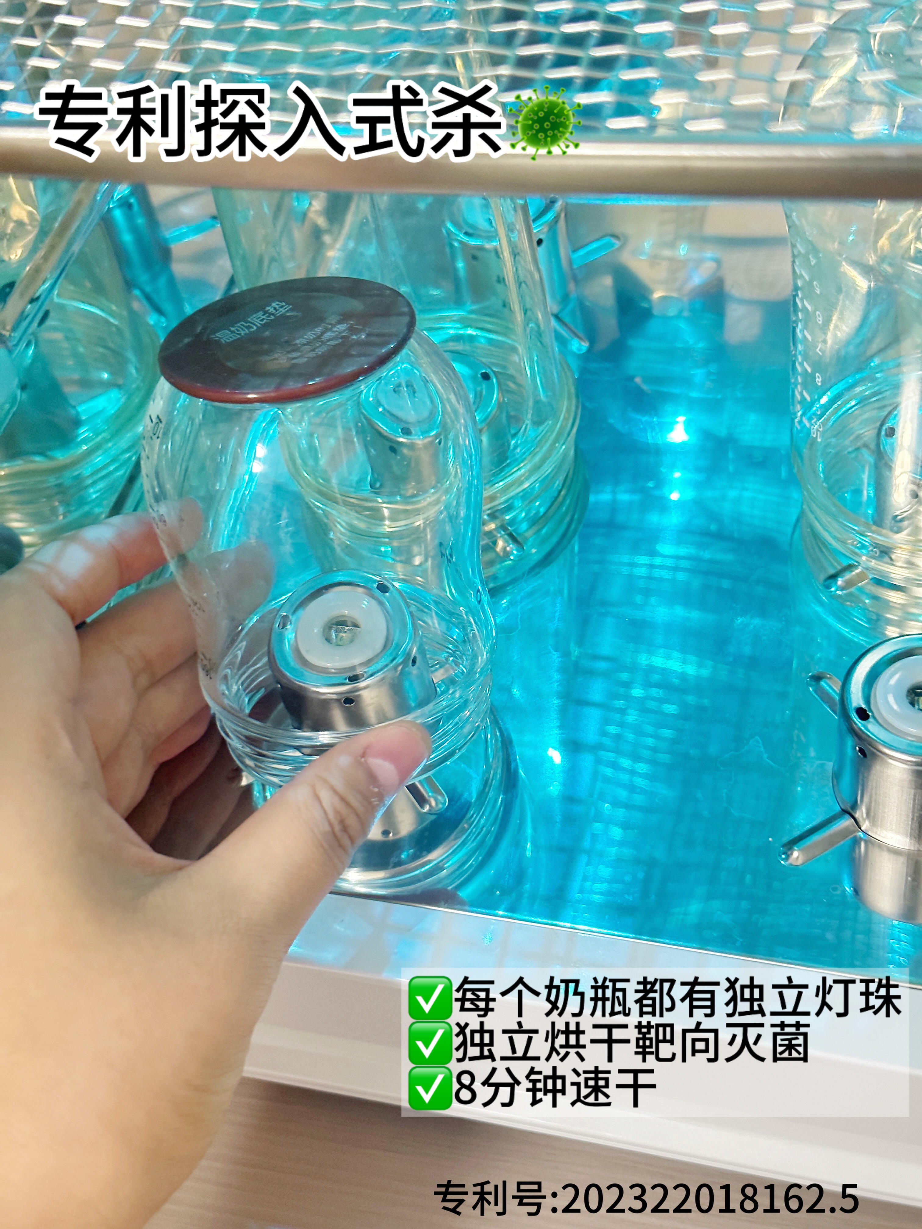 总结: 在解决“奶瓶内部消毒死角”这一核心痛点上,沐婴爱的探入式专利是实打实的结构创新;并且想要实现真正意义上的“0盲区”消毒,是离不开这种能直射内部的技术。
