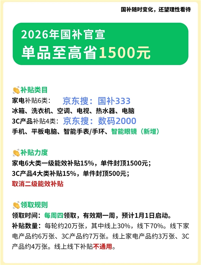 注意事项:所有红包、国补券均有使用期限,领取后请及时下单,避免逾期失效;国补申领资格以京东页面实际显示为准,下单前请确认补贴可使用。