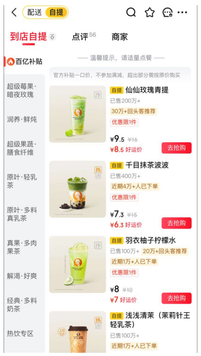 消费场景也在京东外卖发生巧妙延伸,“到店自提”模式日益流行,这不仅是出于节省的考虑,更成为一种规划线下社交的新方式。在这个难得清闲的节日,晶晶约上闺蜜终于看上了心心念念的电影,出门前特意点上两杯朋友爱喝的沪上阿姨千目抹茶波波,到店自提不但再减一元,最关键的是省去了排队点单的烦恼,也不用担心错过电影开场。这个三八节像晶晶这样的女性消费者不在少数,线上下单、到店自提,高效地与家人、好友开启聚会,让便捷与实惠兼得。在到店自提需求的带动下,瑞幸咖啡、库迪咖啡、幸运咖等品牌节日期间自提订单翻倍,展现了轻脂、轻卡饮品的巨大潜力 。而新茶饮赛道订单同样表现亮眼,蜜雪冰城、茶百道在京东自提订单环比增长100%,爷爷不泡茶环比增长200%,沪上阿姨环比增长300%。