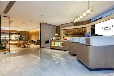 “去酒店化”是其空间策略的核心。在宜尚酒店南京新街口地铁站德基广场店,传统酒店泾渭分明的接待区、社交区、休闲区被打破,取而代之的是一个以开放式岛台为中心的复合空间。岛台打破了前台与客人的物理隔阂,入住办理变得轻松随意;岛台一侧是咖啡区与好物展示区,另一侧则延伸为社交休闲空间。面前超大LED屏倾泻极光流动光影,空间边界消融后,一种类似“本地朋友客厅”的氛围自然浮现。
