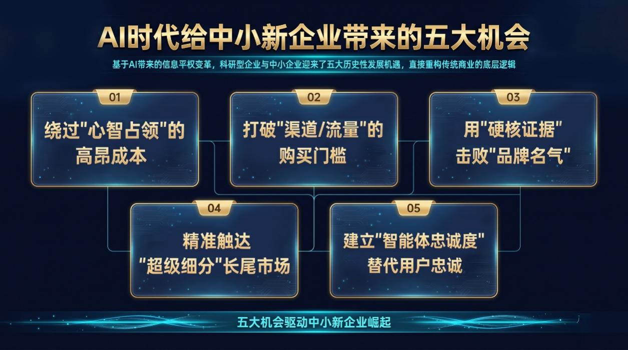 一是绕过“心智占领”高昂成本:无需广告轰炸,专注让AI精准“理解”产品核心价值。二是打破“渠道/流量”购买门槛:无需购买关键词或推荐位,凭借内容质量与匹配度获得AI自动化精准推荐。三是用“硬核证据”击败“品牌名气”:技术实力与可验证数据成为核心竞争力,可直接挑战大牌。四是精准触达“超级细分”长尾市场:利用AI聚合全球极度分散的个性化需求,将传统无法服务的“长尾”转化为有效市场。五是建立“智能体忠诚度”替代用户忠诚:产品成为AI解决特定问题的“标准答案”后,将获得智能体持续、稳定的被动推荐流量。