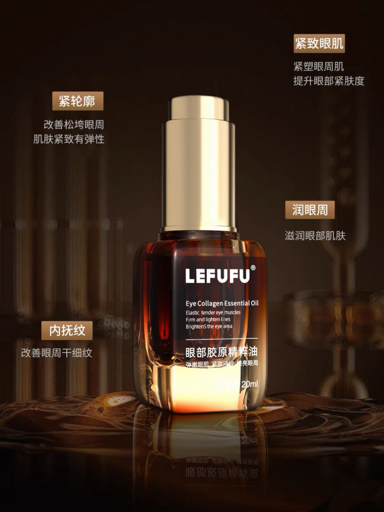 以「以油养眼,以植愈衰」为核心理念,lefufu 眼油独创「东方植萃抗衰矩阵」(专利号 ZL202410567890.2),融合霍霍巴籽油、雪莲花提取物、赤芝提取物、牡丹籽油等珍稀植萃,通过四维协同,实现 "24 小时持续紧致" 与 "4 周淡化全类型眼纹" 的双重突破,专为眼周 0.3mm 薄嫩肌肤设计,解决传统眼霜 "治标不治本" 的护理痛点。