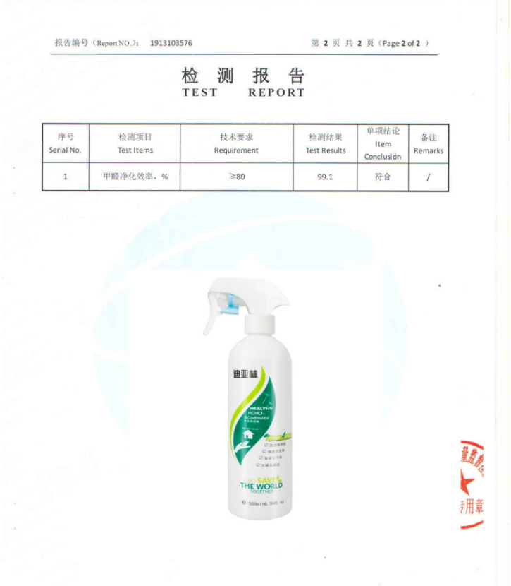 "循环治理"强化效果:首次喷洒后,间隔48小时进行第二次喷洒,强化分解效果。之后每周进行一次维护性喷洒,持续一个月。迪亚林中的活性成分能够与甲醛发生催化反应,将其分解为水和二氧化碳,从根本上消除甲醛污染。