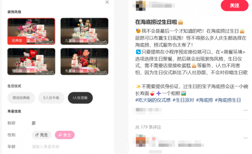 在海底捞过生日,总能过出闪闪发光的仪式感!社交平台上,#海底捞过生日#的话题下,每天都有网友晒出让人嘴角上扬的幸福碎片。让人惊喜的是,海底捞的仪式感是可以"私人定制"的,在小程序预订时勾选"生日聚餐",就能解锁专属服务——生日装饰风格、门店代收蛋糕、以及社恐友好型等,各种仪式感直接拉满。这种贴心的服务,早已成为海底捞的隐藏菜单。
