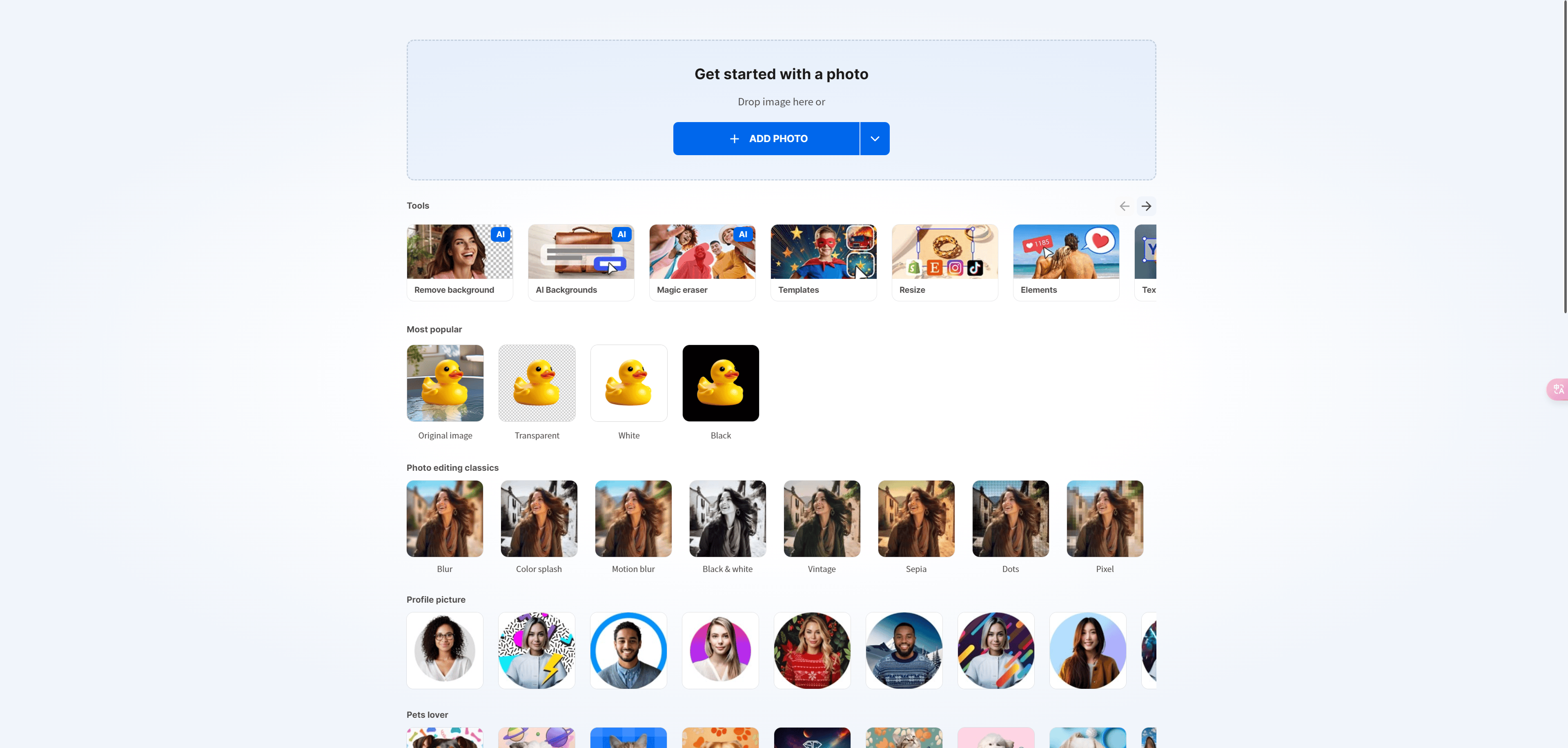 1、进入inpixio官网后,点击【EDITONLINENOW】进入上传图片的页面之后,点击【ADPHOTO】按钮,上传你想要扣掉背景的图片。