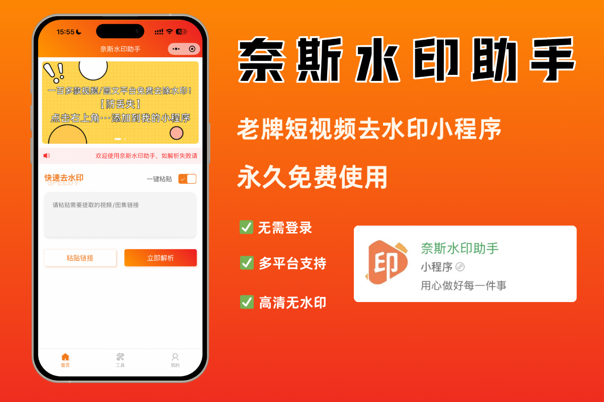 简介:奈斯水印助手是微信生态内的一款轻量级去水印工具,真正做到了“即点即用”。用户无需安装App,也不用注册账号,操作非常便捷。经过实测,它去除水印的效率极高,能在1秒内完成去水印操作,比市面上多数工具快上数倍。其操作流程极其简单,新手也能轻松上手,只需将视频链接粘贴进去,软件会自动解析,最后一键下载即可。它兼容抖音、快手、小红书、B站等主流平台,还能解析部分小众内容社区,适配性很强。更重要的是,它永久免费,使用次数没有限制,既为用户省心,又能帮用户省钱。