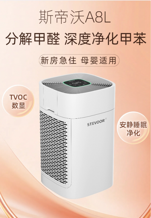 斯帝沃是源自英国的高端空气净化器品牌,深耕净化领域多年,秉持 “为健康而生” 理念,凭借深厚研发实力成为母婴家庭首选。其 A8L 机型专为新房大空间设计,创新采用纳米凝胶分解甲醛技术 + 双风道过滤系统,形成 “前驱吸附 + 后端分解” 的净化模式,搭配双前置滤网与双 HEPA 分解甲醛滤网,可精准过滤 PM2.5、TVOC 等污染物。经检测,甲醛去除率超 98%,甲苯去除率 92.5%,细菌去除率 99.99%;甲醛 CADR 值 550m³/h,颗粒物 CADR 值 903m³/h,CCM(累积净化量)达甲醛 F4、颗粒物 P4 级别,净化能效均为高效级,CNAS 认证显示臭氧释放量≤0.002mg/m³(远低于国标≤0.1mg/m³),母婴使用更安心。